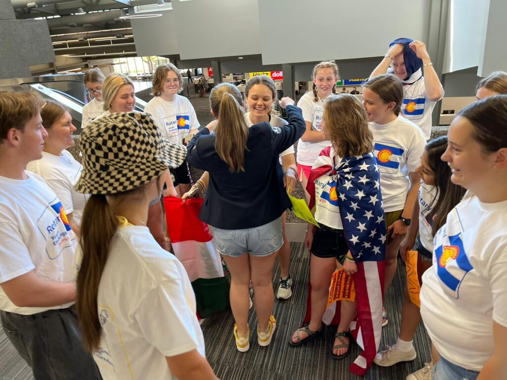 Trecia at the airport with the Rotary Youth Exchange students picking up the Hungarian student for 24-25- wearing Rotary t-shirts