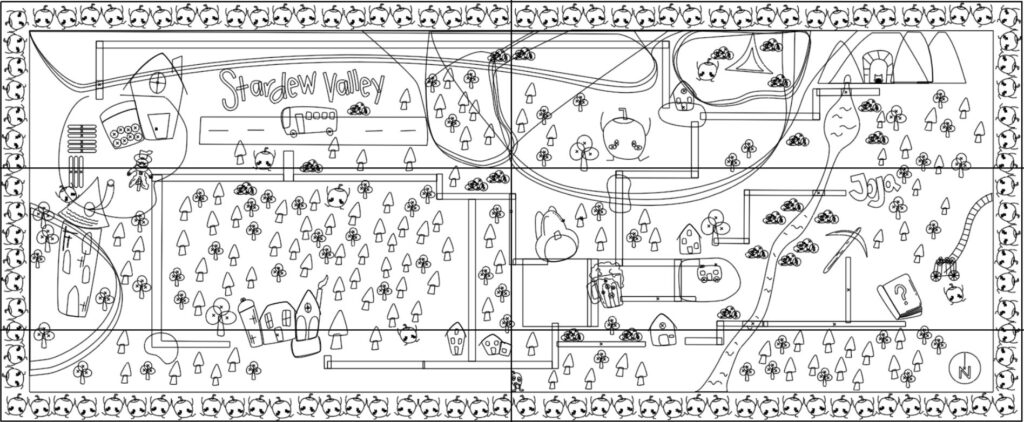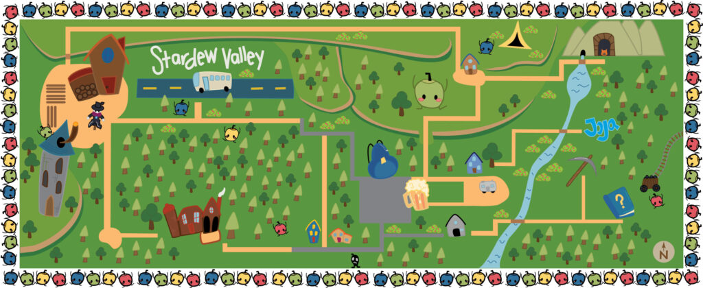 Using Illustrator, specifically the pen tool, recreate a map of your choice. There must be a compass rose, a title, a decorative frame, places and landmarks with their titles, and “sea monsters” or small design elements placed around. The map but also be to scale.